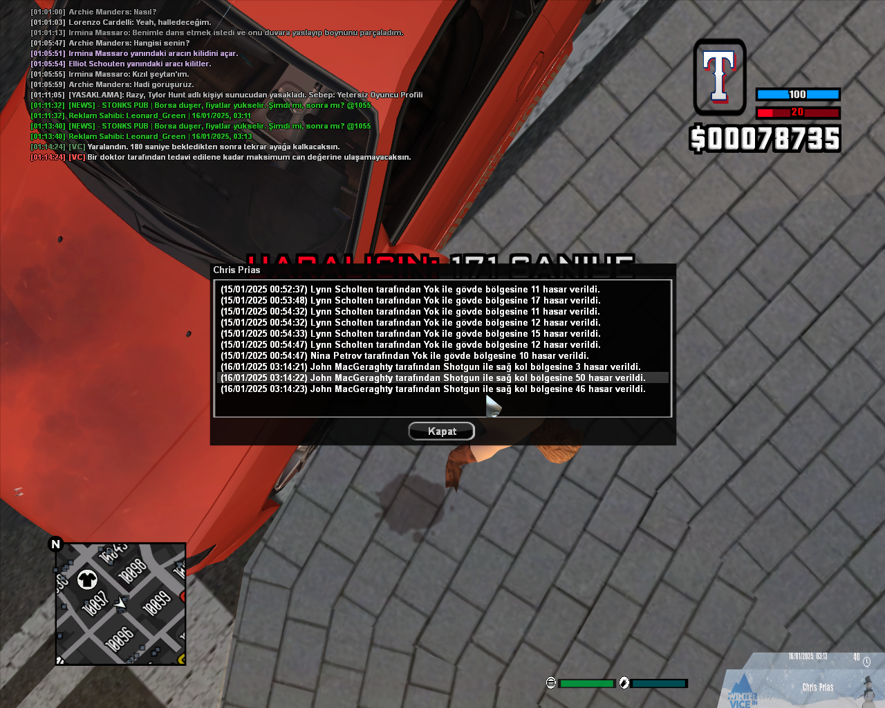 5. DeathmatchingBir karakteri sebepsiz veya yetersiz sebeple öldürmektir. Bunun yanında diğerlerini agresif hareketlere yönlendirecek şekilde basit olaylardan kışkırtma yapmak da aynı şekilde bu kuralı ihlal eder.Bir kişiye araçla çarpma yeterli bir emote verilmeden yapılmamalıdır. Aynı şekilde araçla kişinin üstünde bekleyerek canını bitirip düşürmeye de izin verilmemektedir.- /me adamı ezer. gibi bir yetersiz bir emote ile yapılan hareket ihlal olarak değerlendirir.Örnekler- Trafik kazası sonucu kavga çıkarmak veya ateş açmak- Küfürleşme, tartışma, saygısızlık gibi iletişimle alakalı bir olaydan birisini anında vurmak- Birisi size saldırsın diye sürekli sataşmak, provoke etmek- Bir MC (motor kulübü) ile olan bir savaşta tanımadığınız birisini bölgeden motorla geçiyor diye vurmak- Herhangi bir bölge saldırısında olayla alakalı alakasız herkese ateş açmak