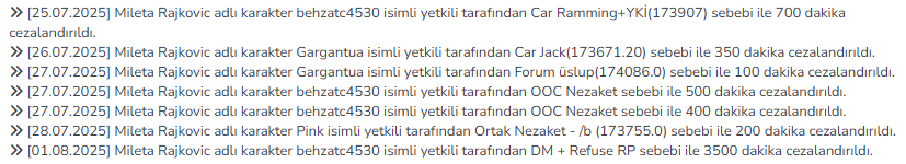 Milo Suozzo karakteri Metagaming ve Non-RP kapsamında cezalandırılacak.