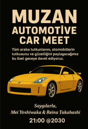 Müşteri çekmek için düzenlenen ödüllü bir Car Meet olacak. Araç tutkunları ve çeşitli insanların bir araya gelerek sosyalleşebileceği bir etkinlik.