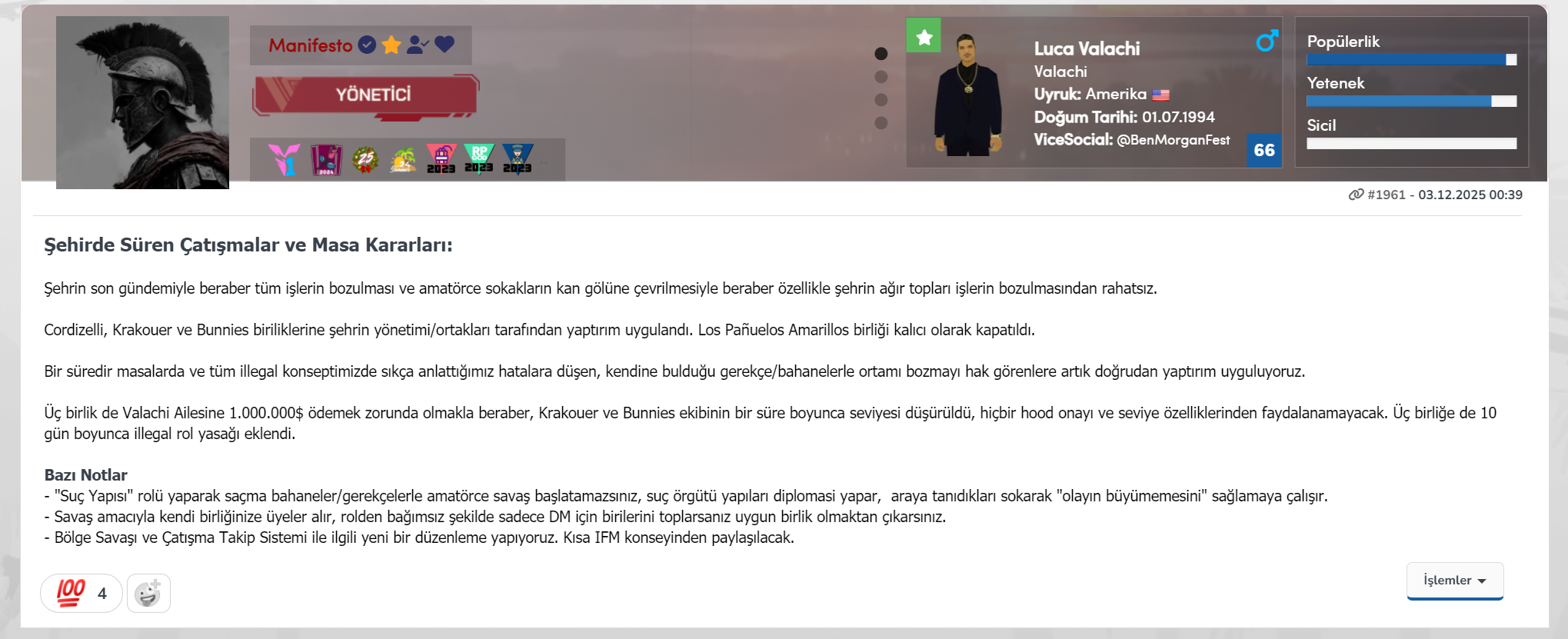 İyi geceler. Jackie Gallino karakterimin Cordizelli birliğinde rol yaptığını herkes bilir, bunu ekran görüntüleri ile de destekleyebilirim. Sistemselde neden olmadığımı bilmiyorum, herhangi bir şekilde birlikten çıkma söz konusu yok, bug veya başka bir şey olarak düşünüyorum. Sonuçlanabilir.