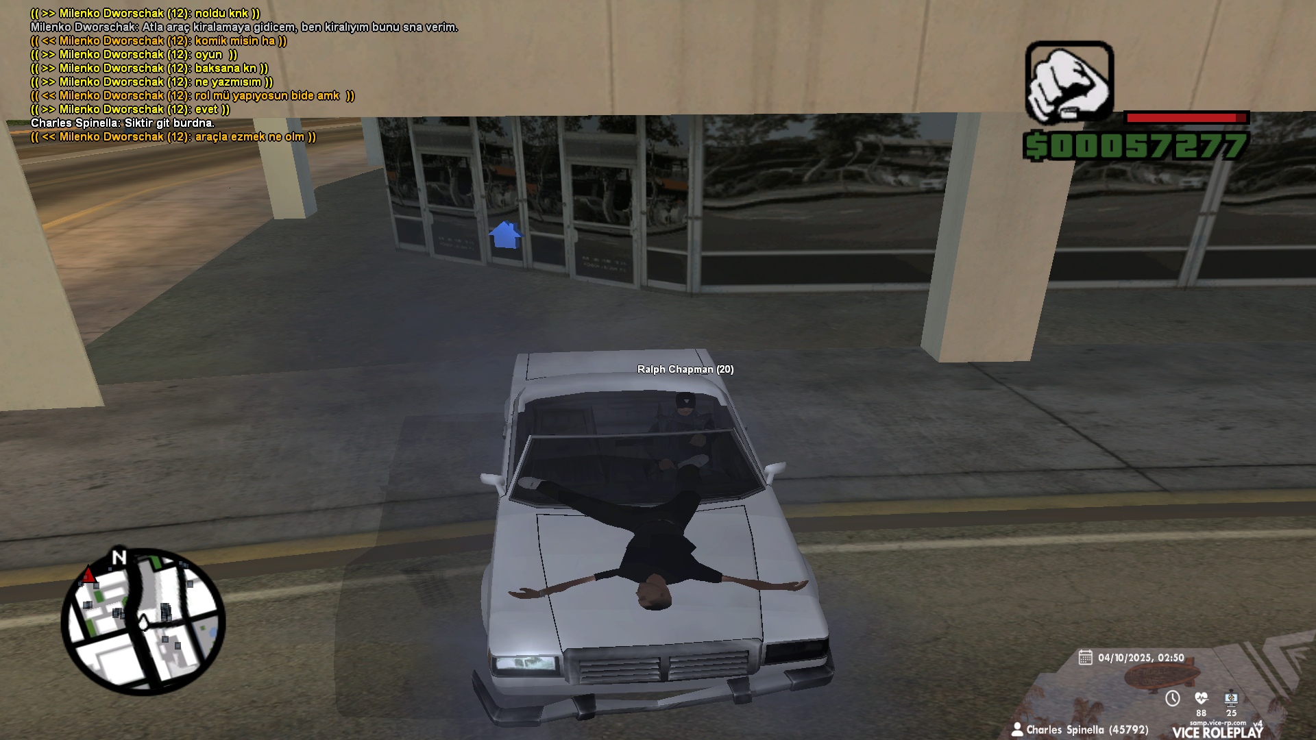 Araç kiralama yerinden motosiklet kiralamıştım yolda giderken karşı taraftan araçla üstüme sürüp çarptılar.Sonrasında durup biri araçla car-dm devam ederken diğeri motorla car-dm atılmaya çalışıldı.Yaraladıktan sonra 60 saniye süre dolmasını bekledikten sonra tekrar araçla car-dm atıldı.İc chatten role uygun olmayan bir şekilde mesajlar atılıp pm üzerinden laubali bir şekilde konuşuldu hem oyun içinde trolling hem ooc olarak saygısızlık olduğu için gereğinin yapılmasını arz ederim.