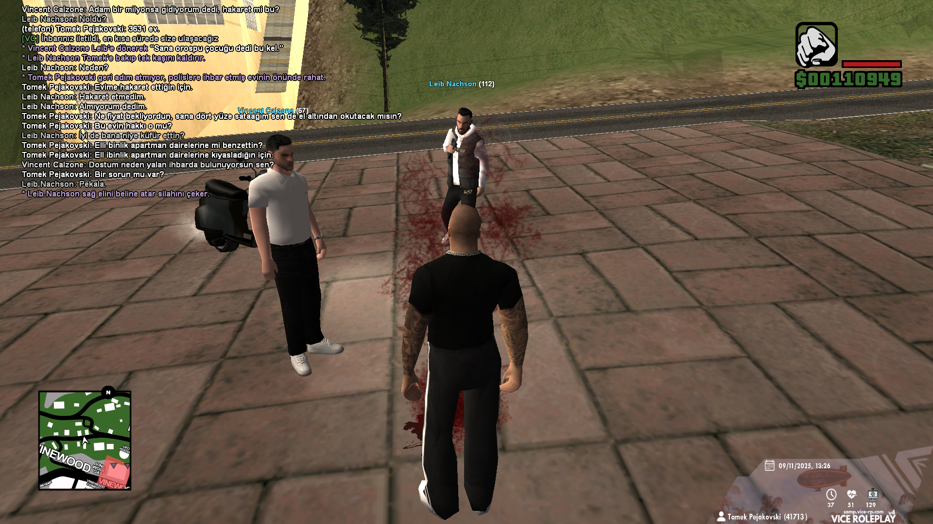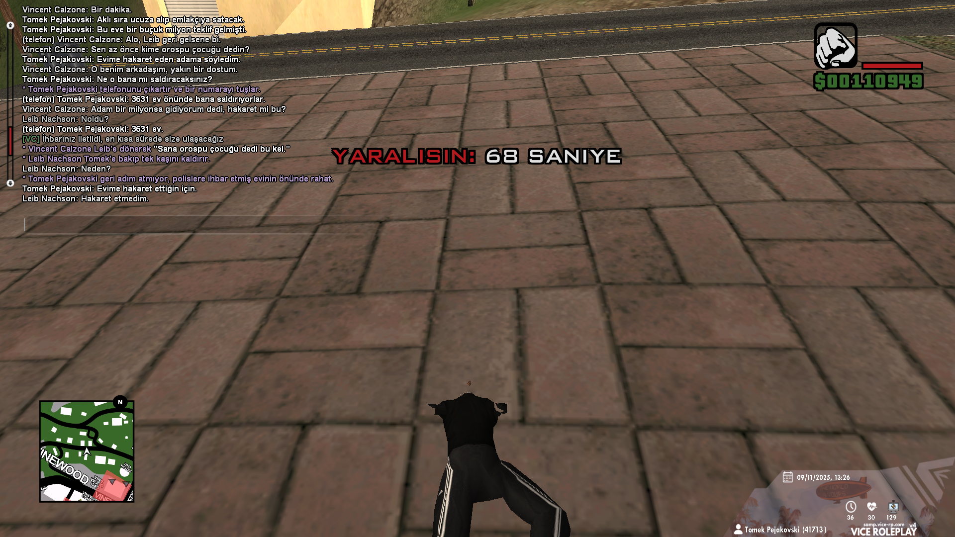 4-) Bu saçma sebep üzerine karakterim seni vuruyor ve sonrasında "Bana küfür ettiğin için" deyip oradan uzaklaşıyor. Silah çekme sebebimse, üstümde silah var ve yanımdaki karakteri emlak rollerinden tanıyorum yani benimle bir olup sana saldıracağı kesin değil, orada senden dayak yeme ihtimalim var. Dayak yersem ve üstüne polis gelirse elimdeki silahtan olacağımı idrak edebiliyorum. Bundan ötürü hızlı bir şekilde seni ettiğin küfür için cezalandırıp oradan uzaklaştım.
