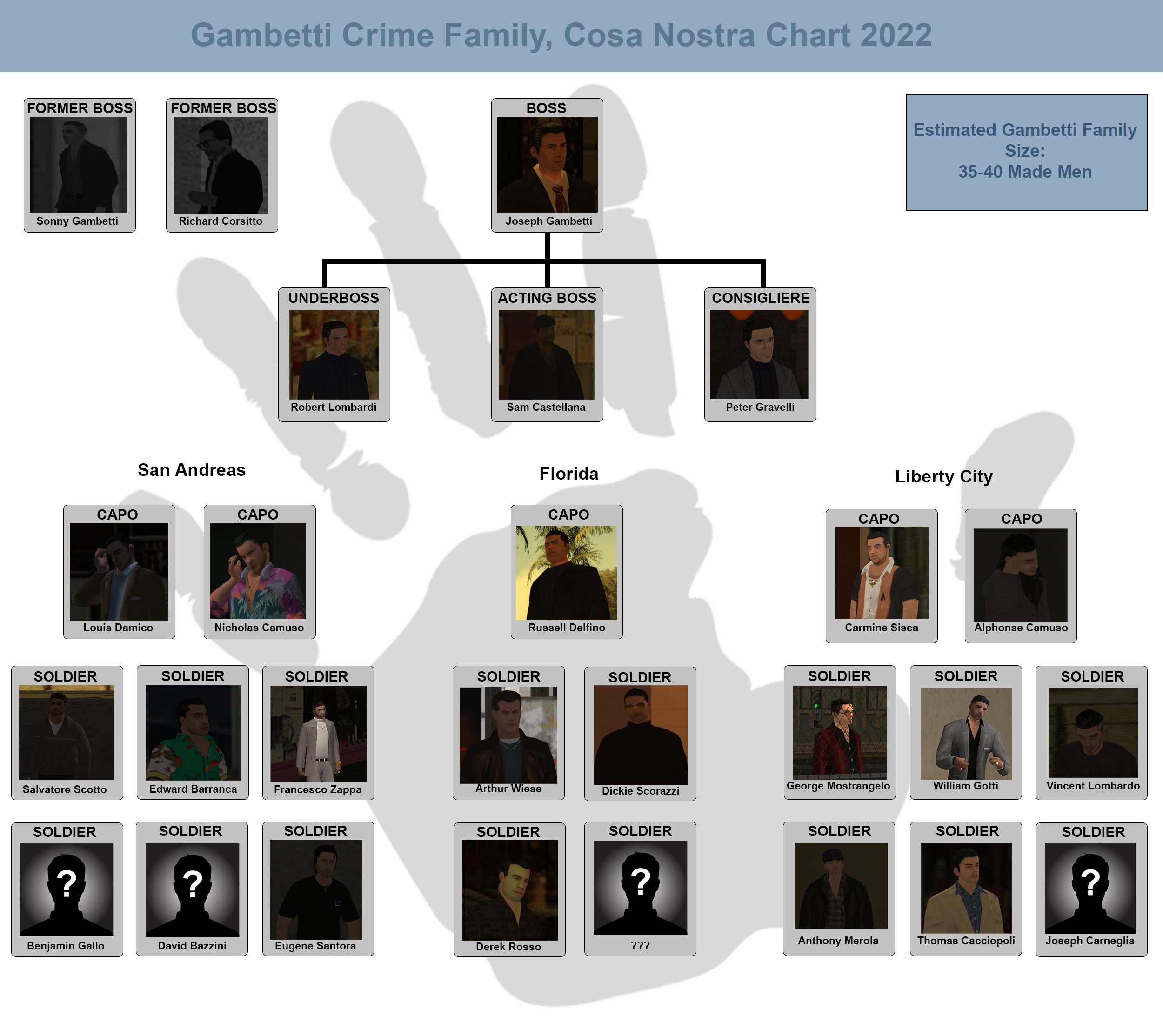 Gambetti Crime Family, Liberty City'de bulunan Cosa Nostra temelli organize suç ailesidir. Gambetti Suç Ailesi'ne bağlı olan Florida'daki Vice şehrindeki ekibi canlandırıyoruz. Tamamiyle İtalyan-Amerikan kültürünü yansıtmayı hedefliyoruz. Florida Ekibi'nin 2022 yılında federallerin teknolojiyi çok farklı şekillerde kullanmasından kaynaklı olarak ailenin teknolojiden korkması ve kalan yıllarını hapiste geçirmek gibi bir niyetinin olmamasından dolayı tamamiyle meşrulaşmaya çalıştığı bir senaryo içerisinde bulunmaktayız. Florida Ekibi'nin, Liberty City'de eskiden Algonquin'de işlerini yürütmesi fakat FBI'ın hala gözlerini ailenin üstünden çekmemesi aileye karşı bir RICO davası açmasıyla tüm işleri mahvedebilmesine sebebiyet verebileceğinden dolayı aile en sıkıntılı ekibi şehirden uzaklaştırarak farklı bir eyaletteki şehre yollayıp kendilerinden uzaklaştırmakta. Bu ekibin ailenin işlerini farklı yerlerde sürdürebilmesi adına Vice şehrini değerlendirmeyi hedeflemesi açısından Delfino ve ekibin buraya yollamış durumda.