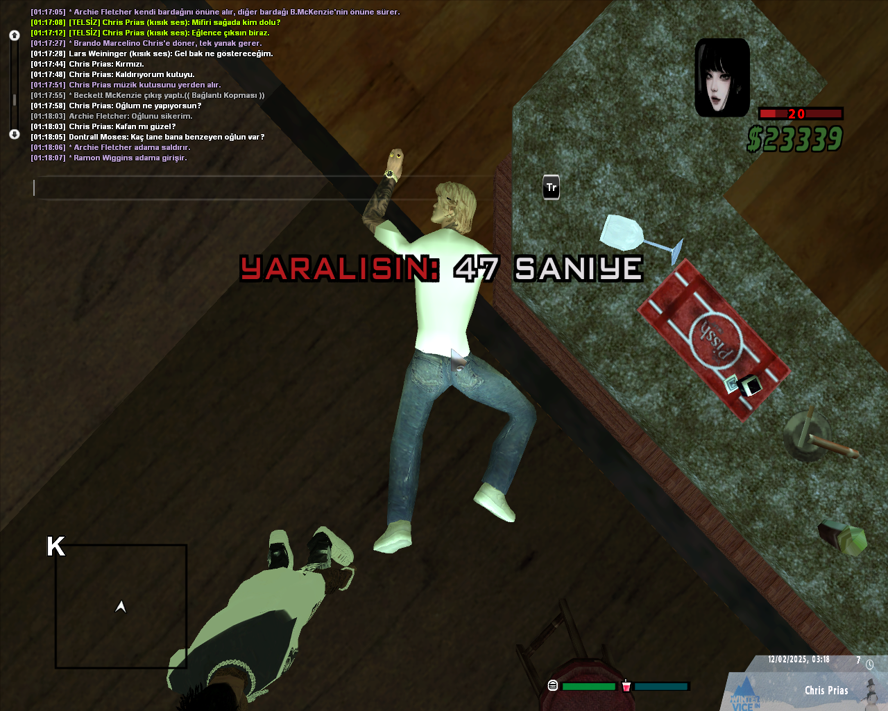 Yapılan ihlali tüm detaylarıyla açıklayın: Öncelikle yaşanan olay tamamen gerçekçiliğe aykırı bir şekilde gelişti. Olayın başına gelirsek, karakterim bir barda, aktif bir rol ortamındaydı. Atmosferi biraz daha eğlenceli hale getirmek için /boombox komutunu kullanarak desk’in üzerine müzik kutusunu koydum ve müziği açtım. O sırada Idlewood Brims üyesi olan Ferris agresif bir tavır sergiledi, ancak bu noktada ciddi bir olay yaşanmadı ve ortamda bir sıkıntı yoktu.