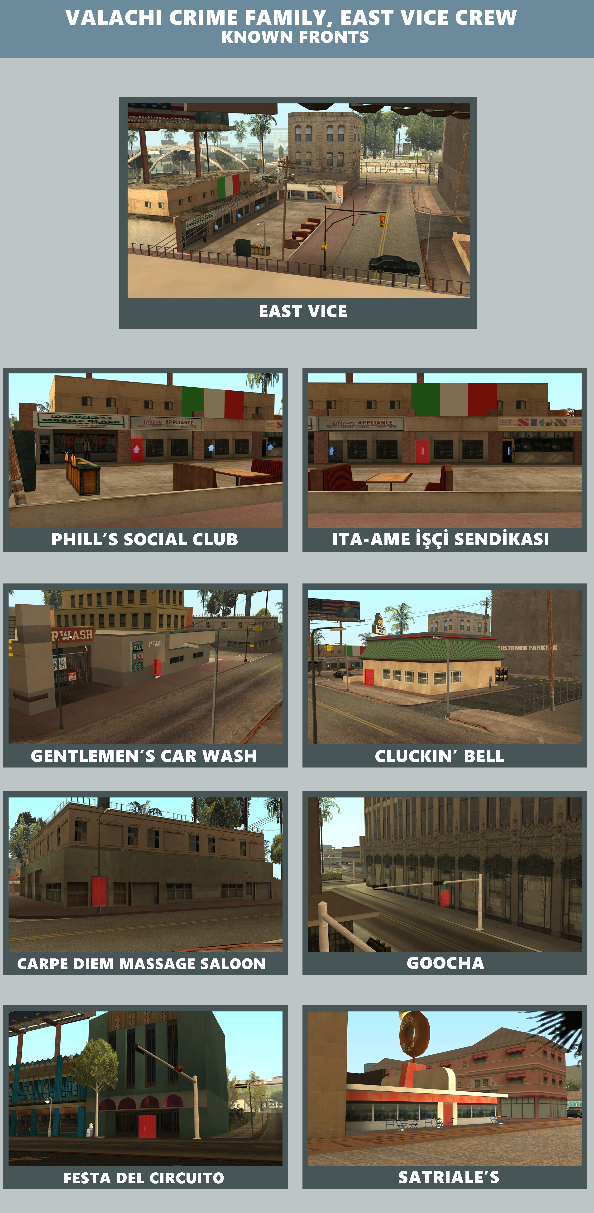 | ____________ | East Vice, DePalma ekibinin ana bölgesi olarak biliniyor, bölgenin içerisinde pek çok işletme mevcut; Phill's, İtalyan-Amerikan İşçi Sendikası, Car Wash, Carpe Diem Masaj Salonu, Cluck'n Bell ekipte bulunan üyelere bu mekanların dağıtıldığı, üyeler tarafından bunların işletildiği biliniyor.