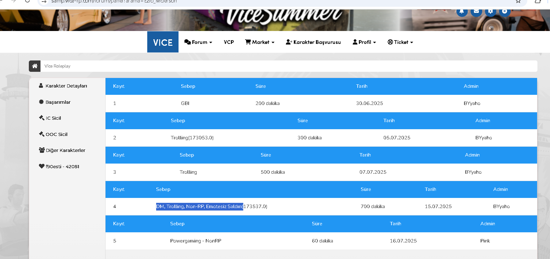 Ek açıklamalar(varsa):[Sizden ricam ilk fotoğrafta göründüğü gibi bir sürü ceza almasına rağmen, uyarılmasına rağmen böyle rol yapıp ıc ooc mix yapıp ooc kin sürüp ana-bacı katmak rol seviyesini aşşağıya çekiyor. Heleki bu sunucu Vice-rp ise kaliteli Rp lerin döndüğü bu sunucuda böyle troll kişiler olunca oyun hevesi filan kalmıyor.   Sizden ricam en ağır şekilde cezalandırılması. İyi Roller dilerim] N/A