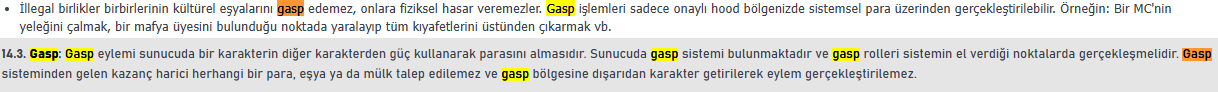 olayın "arkadaş görmek" ile hiçbir alakası yok. yaptığın rolün mantıksal açıdan bir manası olmadığı gibi, sistemsel olarak yapılması gereken bir şeyi emote üzerinden yapıyorsun ki yaptığın şeyin yasak olduğu ibaresi 2-3 kere kurallar üzerinde belirtilmiş. internet sorunudur, fps sorunudur beni bağlayan bir konu değil maalesef, bunların da bir savunma aracı olarak kullanılması doğru değil bence. ayrıca hasar almadığım konusu da doğru değil, burada bir kanıtım yok fakat hasar logları incelenebilir. aldığın paranın miktarı inan gram umrumda değil, rolü kurallarına göre yapsan böyle bir şeye gerek bile kalmayacak zaten. eğer moderatör gibi bir rolün olmasaydı zaten PM üzerinden bölmezdim, sorunu bilerek sana söyledim ki bir şekilde müdahale et veya rolü orada bırak diye. 25.000 sınırı diye bir kural da gasp içerisinde yok ayrıca, dolandırıclık için bir limit o. sen tamamen keyfi olarak miktar uydurmuşsun. kurallara hakim olmadan nasıl ekip üyesi olabilmişsin o da ayrı bir konu.
