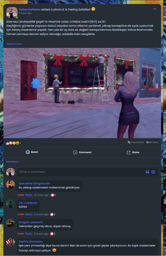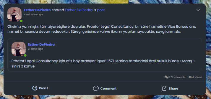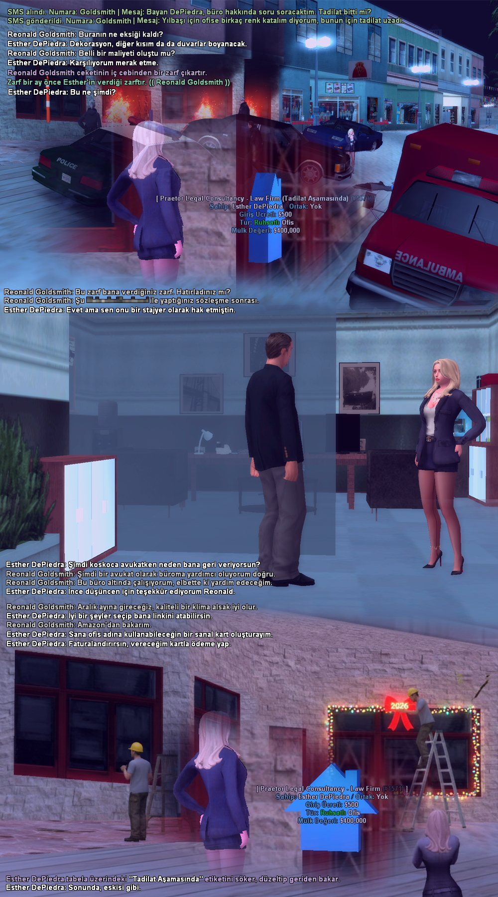 Yaşadığı husumetten(?) dolayı ofisi kundaklanan Esther, ortalığın durulmasından sonra ofisine tadilat yaptırmış. Yetmemiş, üstüne yılbaşı süslemesi de yaptırmayı ihmal etmemiş. Alacağı tazminatı düşünerek fazladan harcama yaptığı söyleniyor.