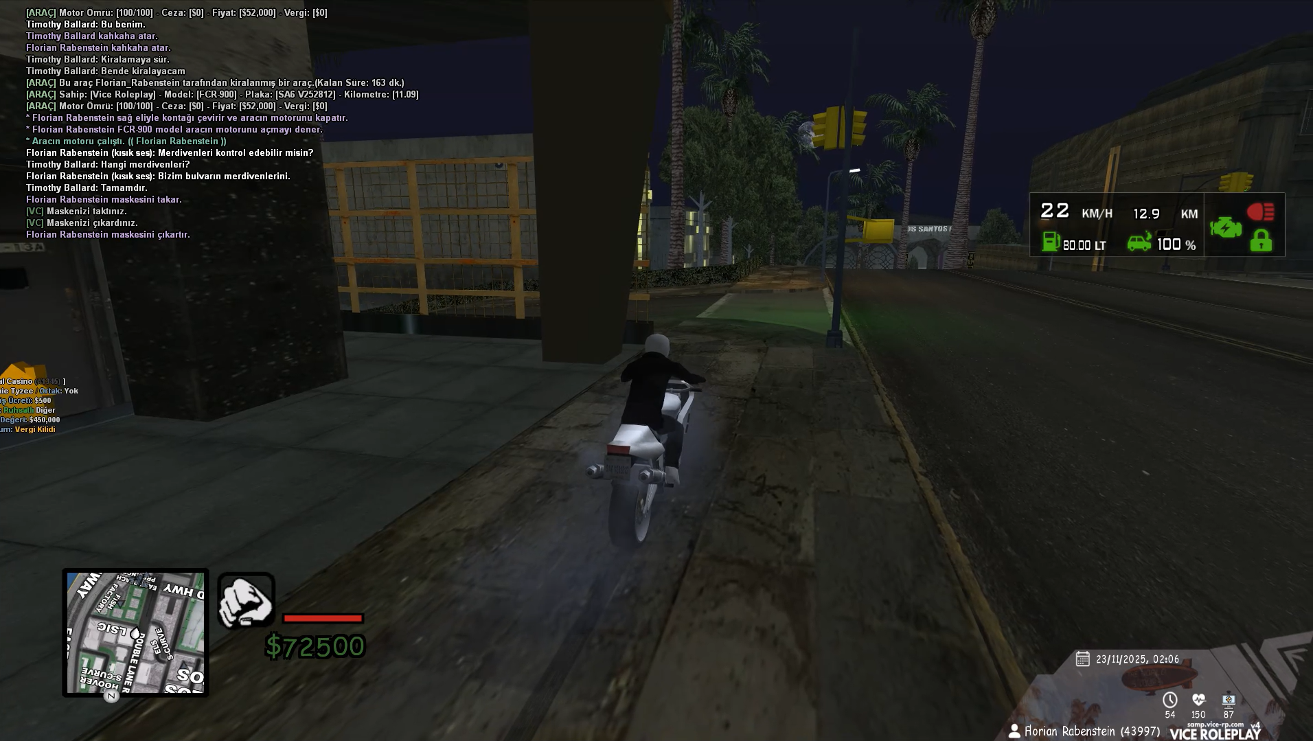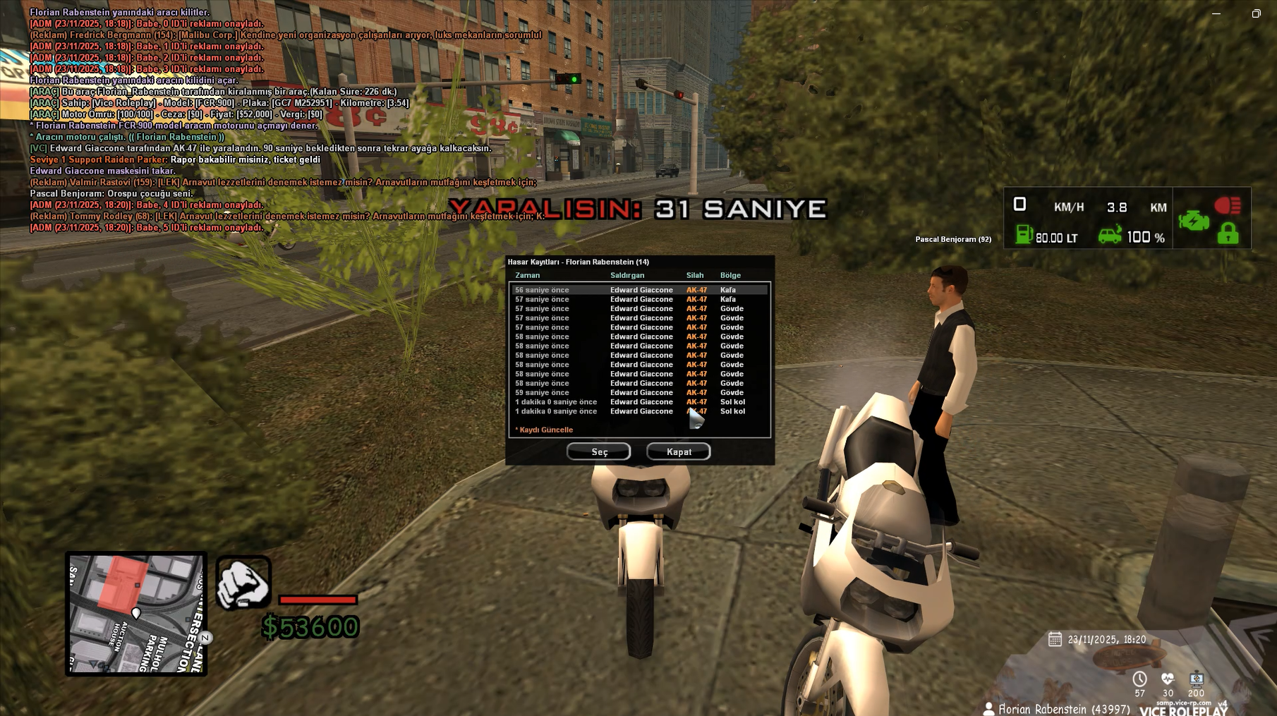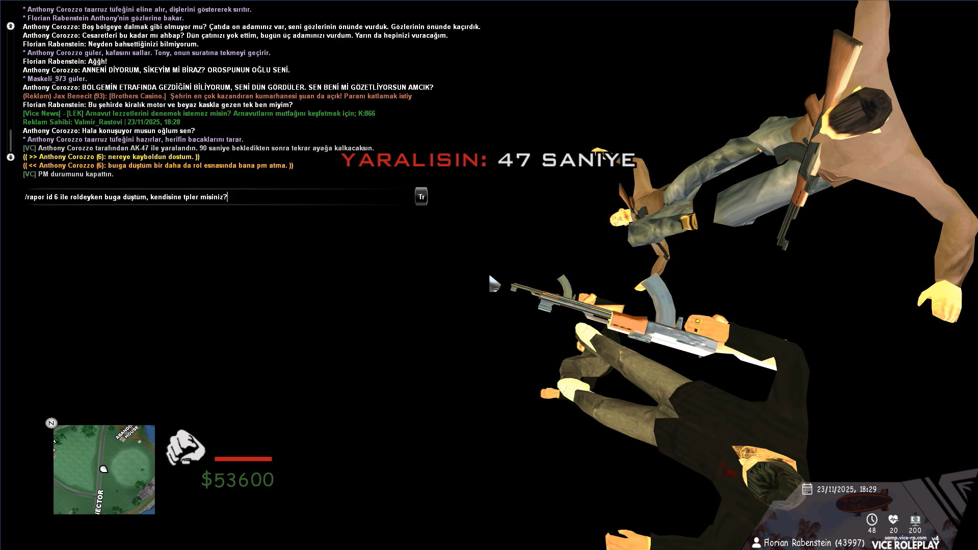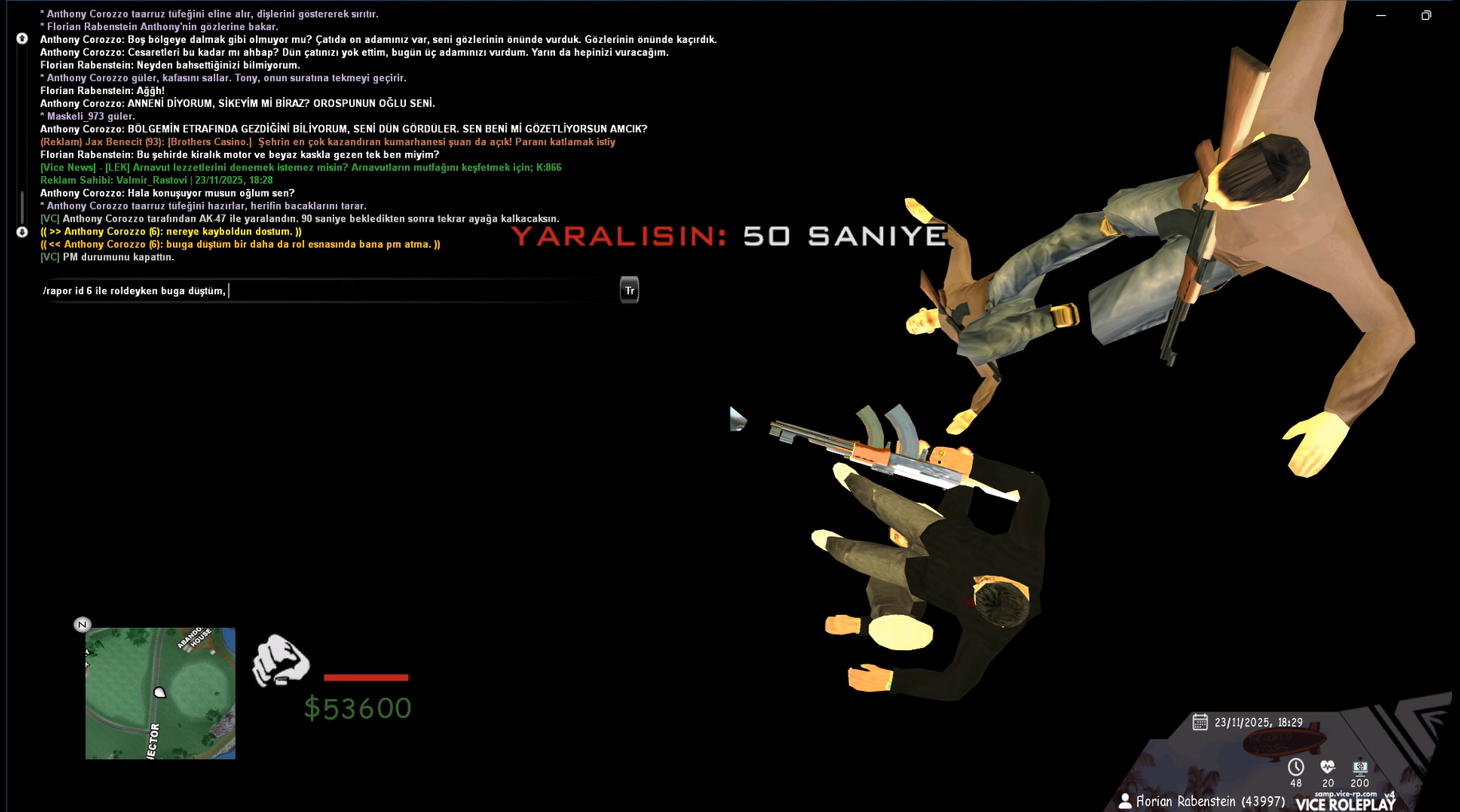Ek olarak karakterim Samuel karakterini dövdüğünde üstüme on kişi birden saldırdınız ve düşürdünüz, bundan yana bir sorun yok. Asıl sorun senin, benim karakterimin üstünde farklı kıyafetler, maske ve kask varken ayrıca kiralık motor kullanırken nasıl oluyorda "bu Florian hadi vuralım" gibi bir şeye kalkışıyorsunuz? Ben aynı şeyleri açıklamaktan gerçekten sıkıldım.