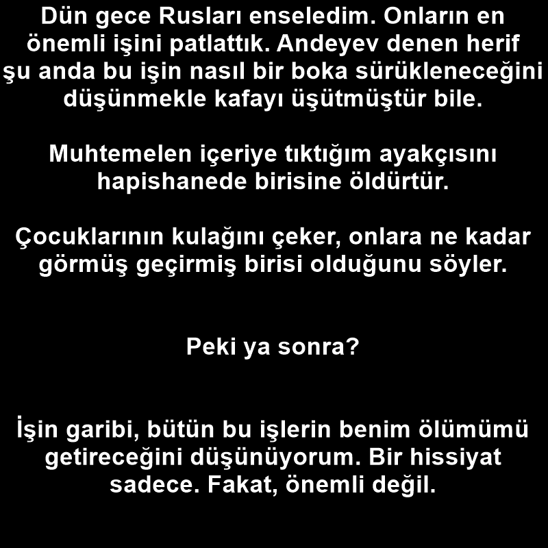 Bazı zaferler yıllar sonra ribon ve ödüller ile değil, sahibine mermi olarak döner. Silahına kılıfını koyduğun gün hayatta kaldığını zannedersin, ama sadece tabuta girişini biraz daha hızlandırırsın. Ölüm her zaman kapıyı eski bir dost ve tatlı anılar ile çalmaz. Sessizce zamanını bekler ve görür.,